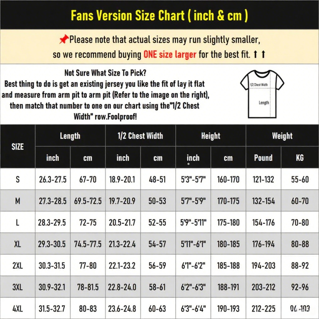 Please note that due to measurement errors. there may be a 1-2 inch discrepancy between the actual jersey size and the size chart. which is considered normal. If your measurements fall between two sizes or if you are overweight or have a muscular build. we highly recommend purchasing a larger size to ensure a more comfortable fit and better wearing experience.